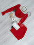 Conjunto de saia forrada e top com decote descaído.