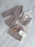 Conjunto de 3 peças composto por top, saia e blazer.