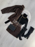 Conjunto de pelinho composto por saia e casaco.