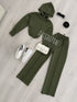 Conjunto de calça e camisola com capuz e atilhos nas costas.