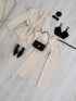 Fato composto por blazer forrado com ombreiras, calça com elástico na zana da cintura e cinto incluído.
